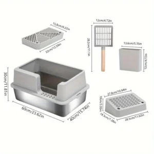 Provide a hygienic and comfortable environment for your cat with the Stainless Steel Cat Litter Box with Mat and Sand Shovel. This product offers a practical and effective solution for maintaining the cleanliness and well-being of your feline, as well as preserving the hygiene of your home.